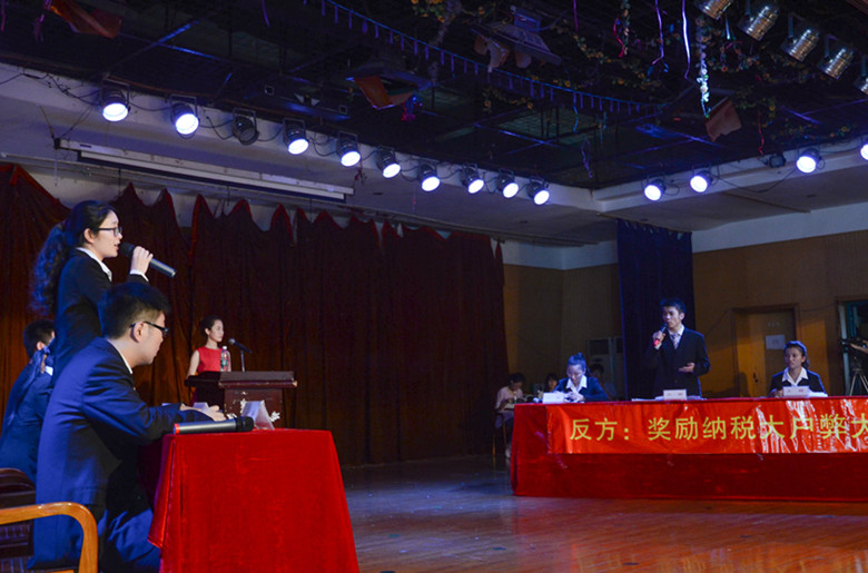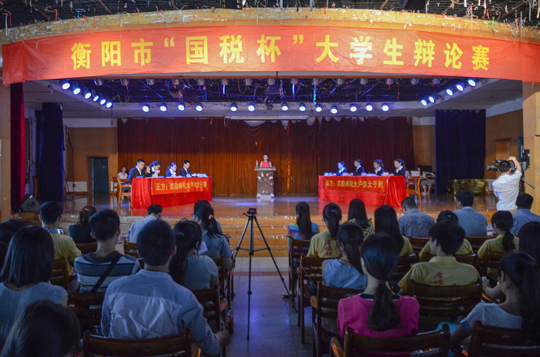 为促进衡阳各大高校的交流,宣传落实党的十八届三中全会精神,由中共衡阳市委宣传部、衡阳市国家税务局主办,南华大学党委宣传部、共青团南华大学委员会、衡阳有线电视台承办的衡阳市“国税杯”大学生辩论赛半决赛于5月24日在北校活动中心成功举行。莅临的评委有衡阳日报纪委书记邓湘源、衡阳市委组织部三科科长阳丽萍、衡阳市国家税务局副局长陈洪贵、衡阳师范学院冯林老师、湖南环境生物职业技术学院团委副书记邓雄峰以及南华大学相关领导。