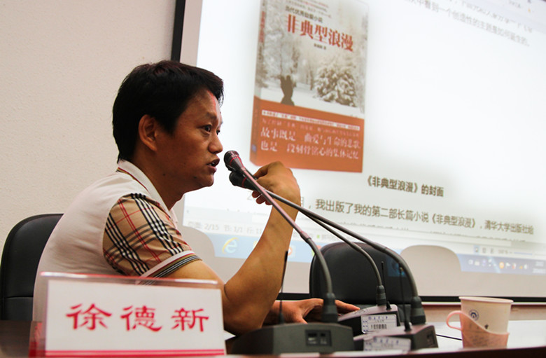 在报告会上,徐德新校友对报告的题目《非典型浪漫》与原创文学—有一种浪漫,叫励爱进行了详细的解释,之后,徐德新校友讲述了他的创作过程,提出现代文学具有快餐化、消费化的特点,认为创作需要能耐得住寂寞、透过现象看本质、有逆向思维、保持心灵的纯净、敬畏自然和生命。在报告结束后,徐德新校友和在场听众进行了互动交流。