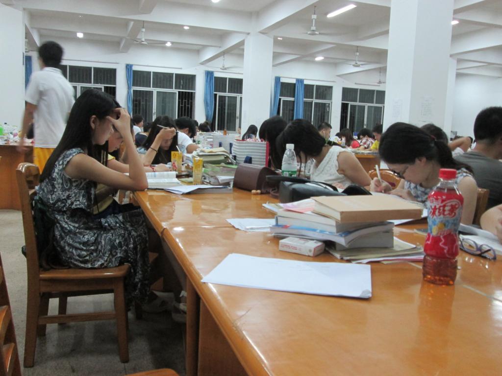6月18日上午8时,南华大学雨母校区图书馆一楼自习室。此时,大半个自习室已被前来学习的同学占用了。荧光笔划过一行行的重点,笔尖勤快地在草稿纸上转动着,书本被干练地翻过一页又一页……紧张而又高效的空气在室内弥漫开。同学们有的双眼微闭,投入地默背重点;有的豁然一笑,欣慰解除难点;有的焦虑不安,执著地钻研难题;有的甚至咬几口馒头,继续学习……电风扇的转动声里,进入室内的脚步声、通往三楼自习室的匆忙声十分清晰。