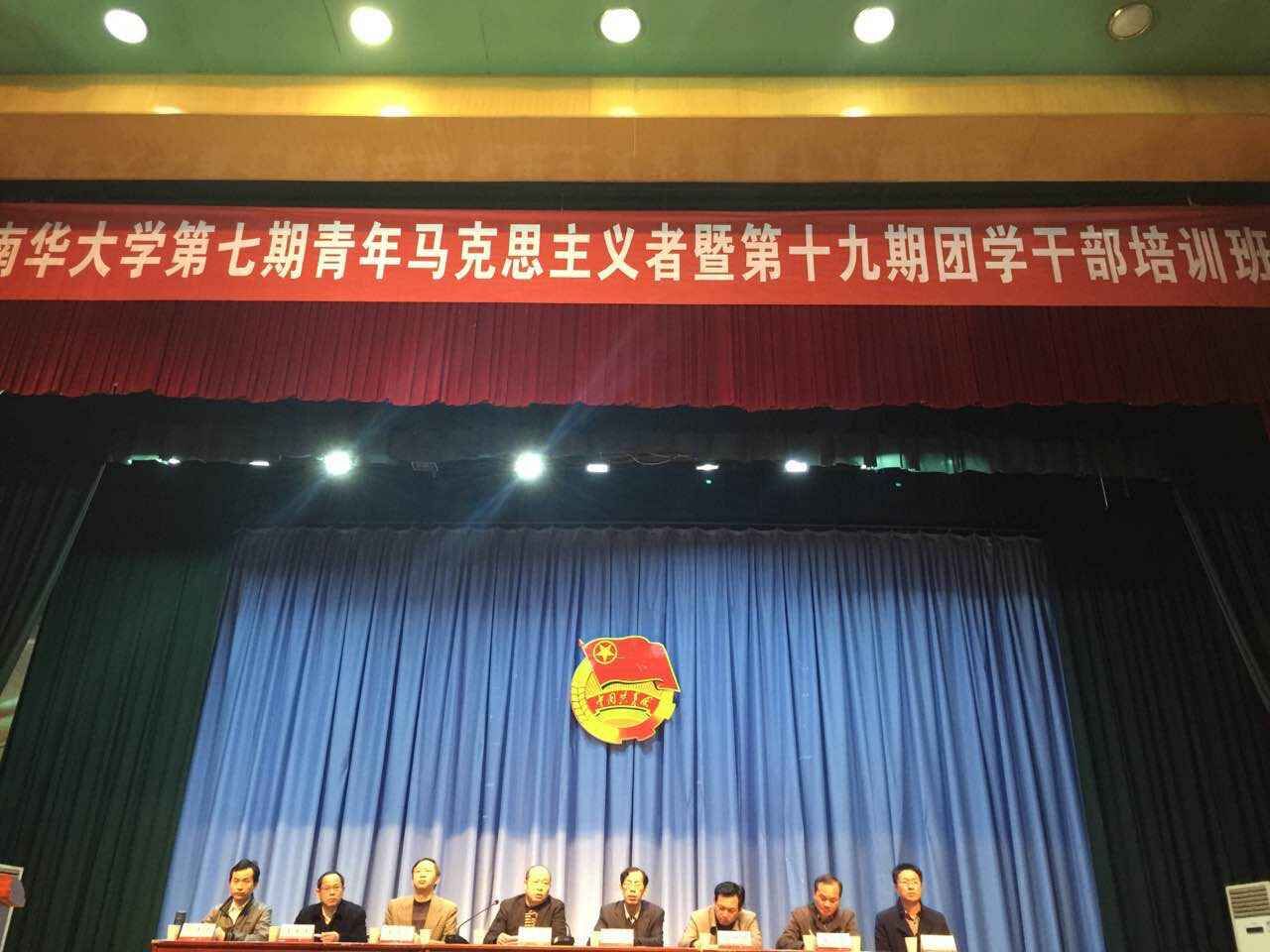 (通讯员文青 王楚玥 摄 刘阳)2015年11月15日,南华大学第七期青年马克思主义暨第十九期团干培训于红湘校区南校大礼堂正式开班。副校长刘升学、党委宣传部部长彭建军、学生工作部部长潘本衡、校团委副书记刘文君、李海洋担任本次培训的主讲老师。来自校团委学生会各部门、18个学院的青马学员及团干成员参加了此次培训。