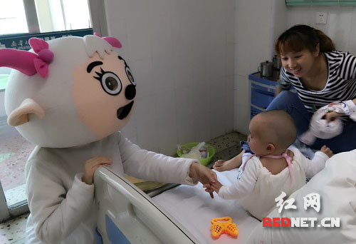 志愿者们扮成喜羊羊、美羊羊、维尼熊,走进该院急诊儿科,给小患者们带来一波又一波的惊喜。“哇,妈妈,你看,是美羊羊!”“小朋友,你好!我是你的朋友美羊羊。今天,我是来陪你过儿童节的哦!你是个勇敢的好宝宝,打完针,我们一起去看电影好吗?”