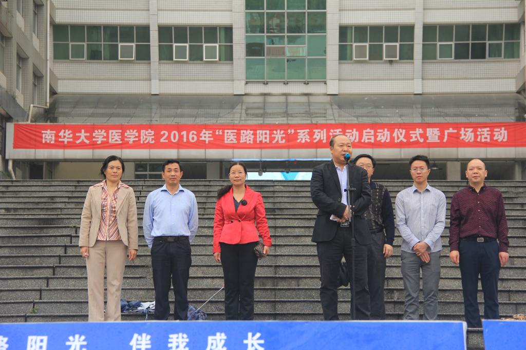 上午8:00启动仪式开始。首先,由刘安元副书记带领全体师生齐诵《医学生誓词》“健康所系,性命相托……”虽然天空下着小雨,但是在场的医学生紧握右拳,目光坚定,语言铿锵有力,用响亮的声音表达对祖国医学事业的无比忠诚。仪式第二项,何战胜副书记介绍活动实施方案:2016年4月—12月,学院以“医路阳光”为主题,深入开展创建“医品牌”特色活动,活动分为三个阶段进行;整合现有50项团学活动资源,按照“明德篇、博学篇、求是篇、致远篇”提炼分类,强化内涵,突出特色;通过开展争创“医品牌”特色活动,在此基础上逐年进行持续改进,形成“以医品牌为主,促进全面发展”的医学院学生工作特色。仪式第三项,学生代表吴宇鹏上台发言,他倡议:全院同学树立高度的社会责任感和使命感,用实际行动积极争创“医品牌”,切实提高自身综合素质,为南华大学、南华大学医学院增光添彩。仪式第四项,刘升学副校长做重要讲话,他高度评价了医学院在学生工作方面取得的突出成绩,及医学生在国家、学校开展的各项竞赛和活动中的优异表现。他指出:“医路阳光”活动很好地结合医学院学生工作特点,希望全院师生积极参与,创出特色,打造“医品牌”,在引导大学生成长成才方面发挥更加积极的作用,祝愿“医路阳光”系列活动取得圆满成功。最后,陈熙院长宣布南华大学医学院2016年“医路阳光”系列活动正式启动。