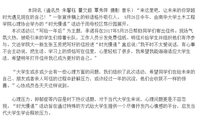 上一条:【湖南日报】文教版头条:筑巢孵凤 生机涌动 下一条:【湖南教育新闻网】南华大学“时光慢递”,关注大学生心理健康