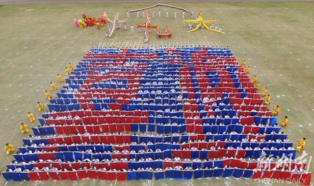 10月13日,南华大学的大学生在校运会开幕式上用彩旗,龙、狮等民族元素组成喜迎十九大的字样,表明了当代大学生传承中华民族优秀的传统文化、喜迎十九大的胜利召开的心愿。 夏文辉 曹正平 摄影报道