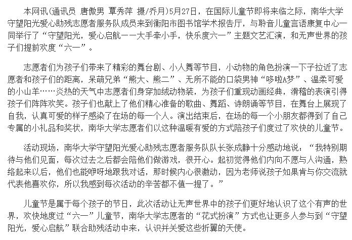 上一条:【光明图片】大学生志愿者陪聆音儿童共度欢乐六一 下一条:【湖南教育新闻网】南华大学与尼泊尔博卡拉大学签署教育合作与交流备忘录