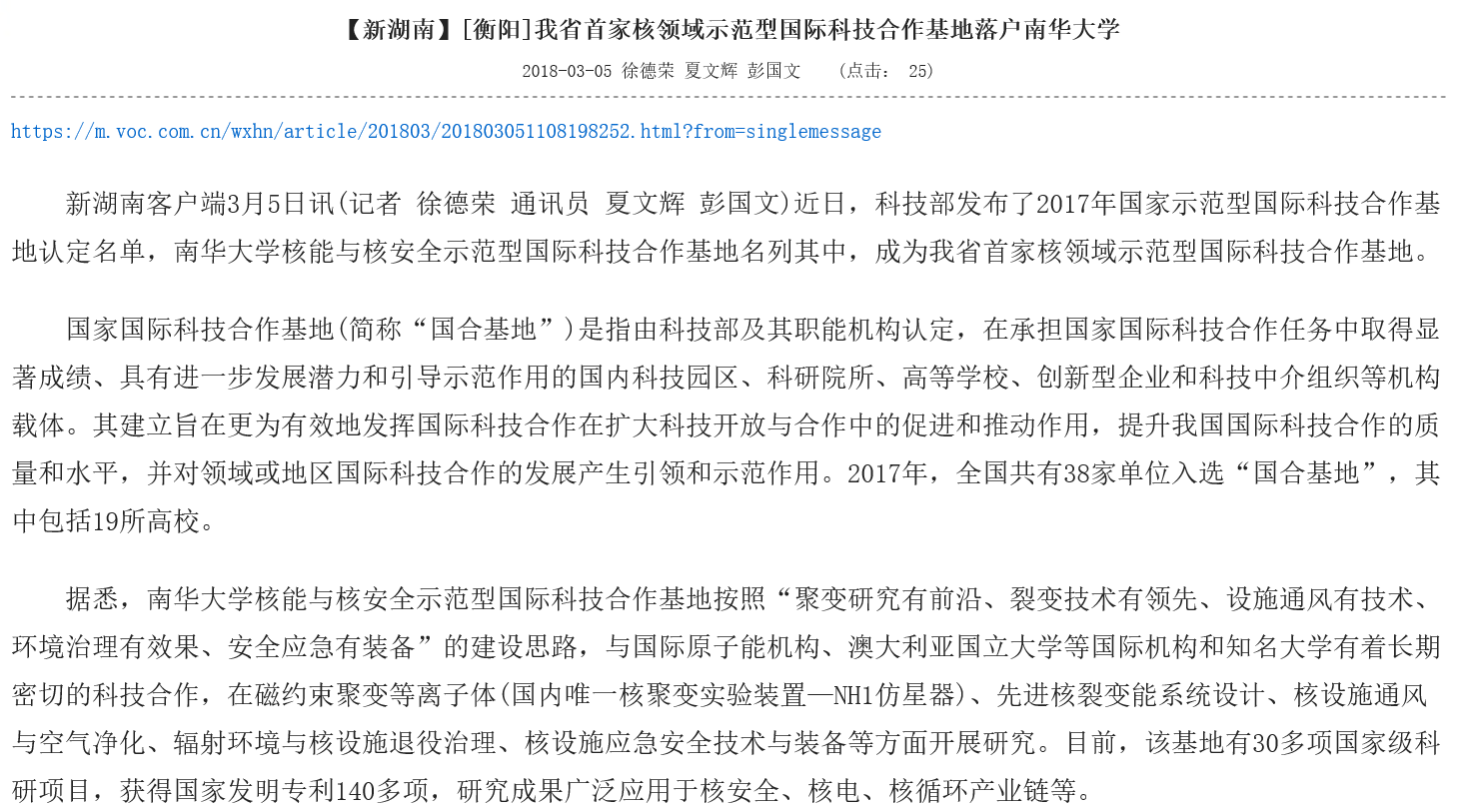 【新湖南】[衡阳]我省首家核领域示范型国际科技合作基地落户南华大学