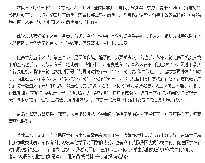 上一条:【湖南教育网】棋逢对手,南华大学棋手征战衡阳高校联谊赛 下一条:【湖南教育新闻网】百余名大学生志愿者千里徒步,公益捐步为爱而行